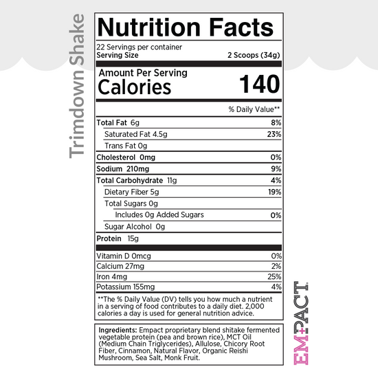 Empact proprietary blend shitake fermented vegetable protein (pea and brown rice), MCT Oil (Medium Chain Triglycerides), Allulose, Chicory Root Fiber, Cinnamon, Natural Flavor, Organic Reishi Mushroom, Sea Salt, Monk Fruit.