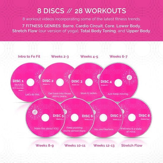 You get MORE than any other program. For less. The Basic Kit includes: 28 workouts on 8 DVDs (that's nearly 14 hours of workouts!), a 21 Day Calendar, a download of the Total Body Toning Guide and a User Guide - the map to plan your fitness journey. It also includes 6 Week Tracking Calendars for Weight Loss and Toning and 90 Day Calendars customized for working out 3, 4 or 5x a week. With the Combo Kit you get all of that PLUS the Fé Fit Powered by Naturally Fit Customized Nutrition Plan.